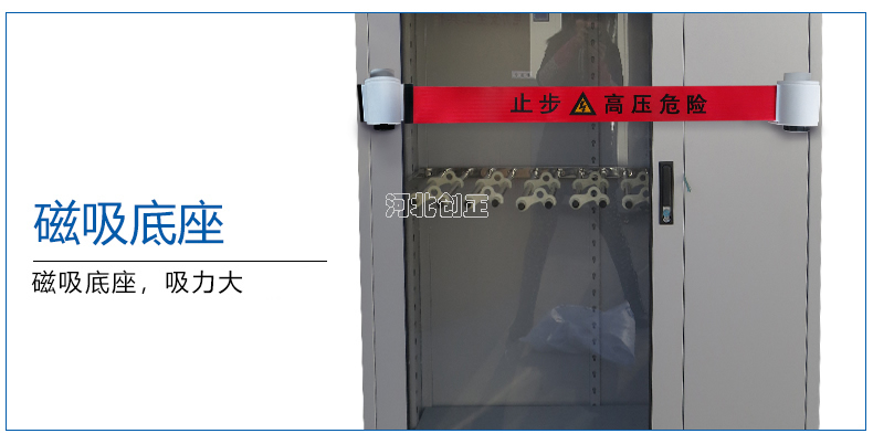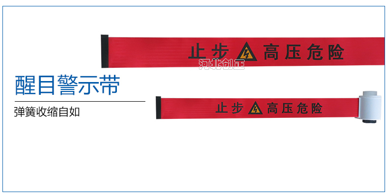 警示帶盒是ABS材料制成;帶是錦綸材質,上面印有“閃電符號,止步,高壓危險”等字樣。