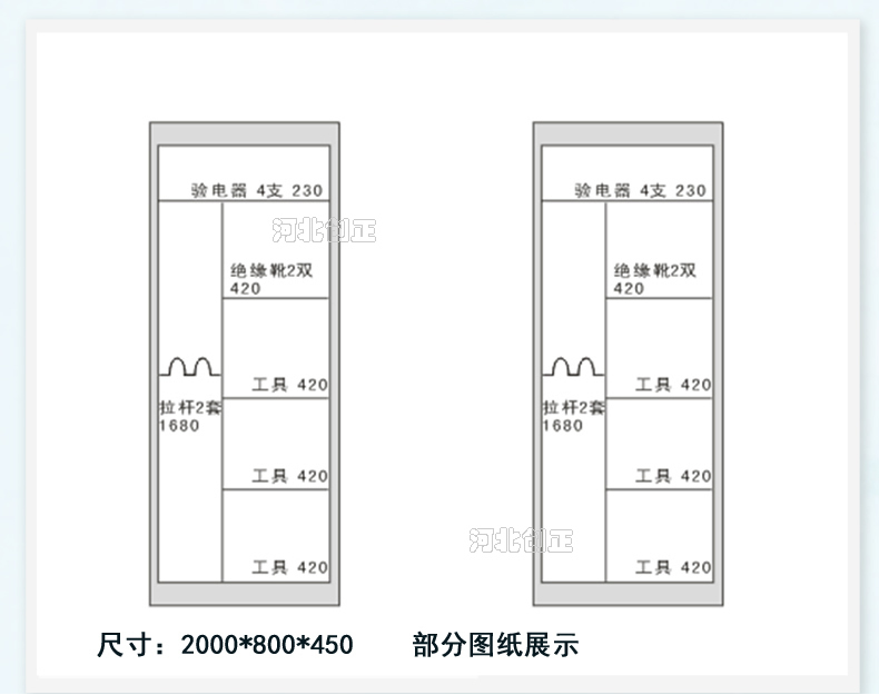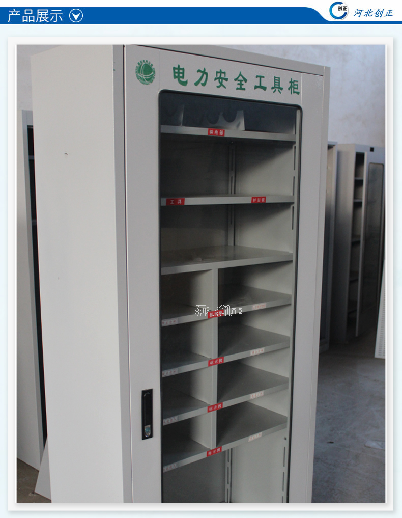1、柜體是冷軋鋼板卷壓成型,厚度有1.0mm,1.2mm,1.5mm供選擇。柜體表面采用靜電防腐噴塑工藝,顏色為駝灰色,柜門裝有通體透明鋼化玻璃,透過玻璃可以看到分類有序的工器具。