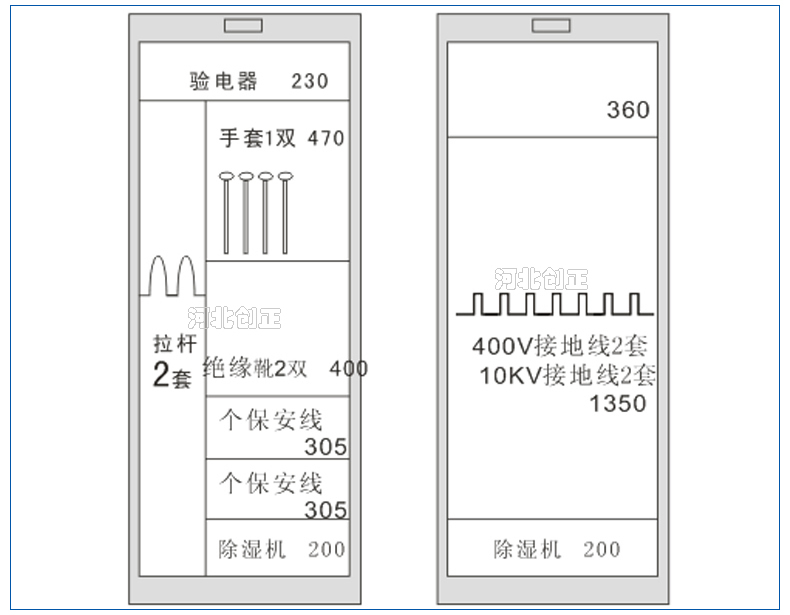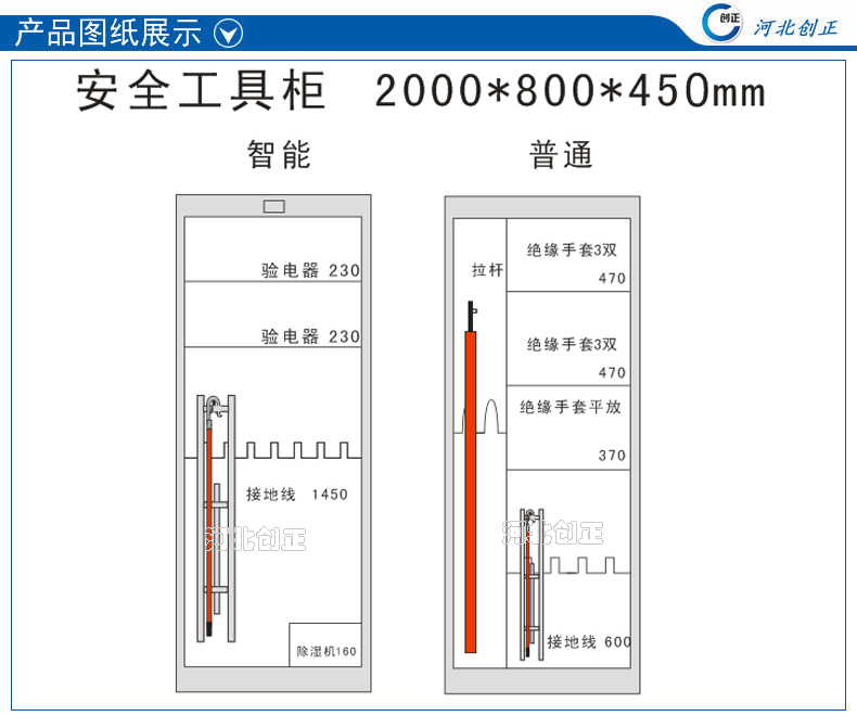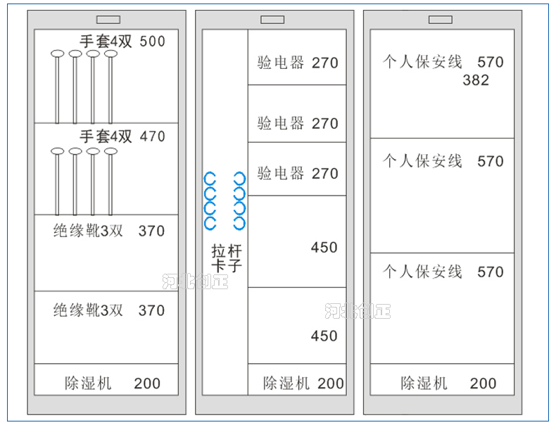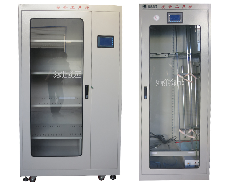 2、智能型安全工具柜裝有溫濕度顯示表和控制操作面板,顯示溫濕度和設備運行狀態(tài)。柜底可選擇安裝萬向輪和定位螺桿;柜頂可選擇安裝吊杯,方便運輸。應用于不同溫濕度地區(qū)的不同電壓等級的變電站、集控站、線路工區(qū)以及電力公司等單位。